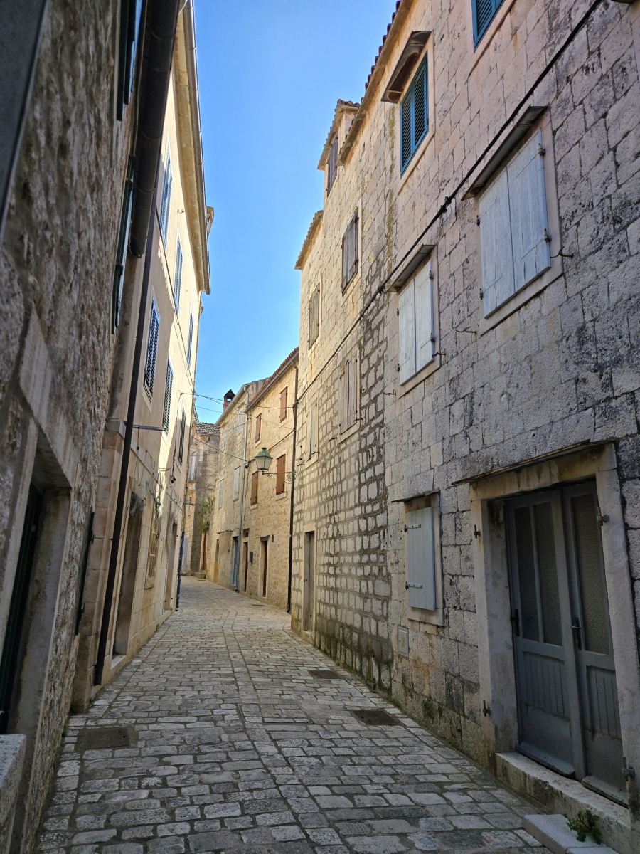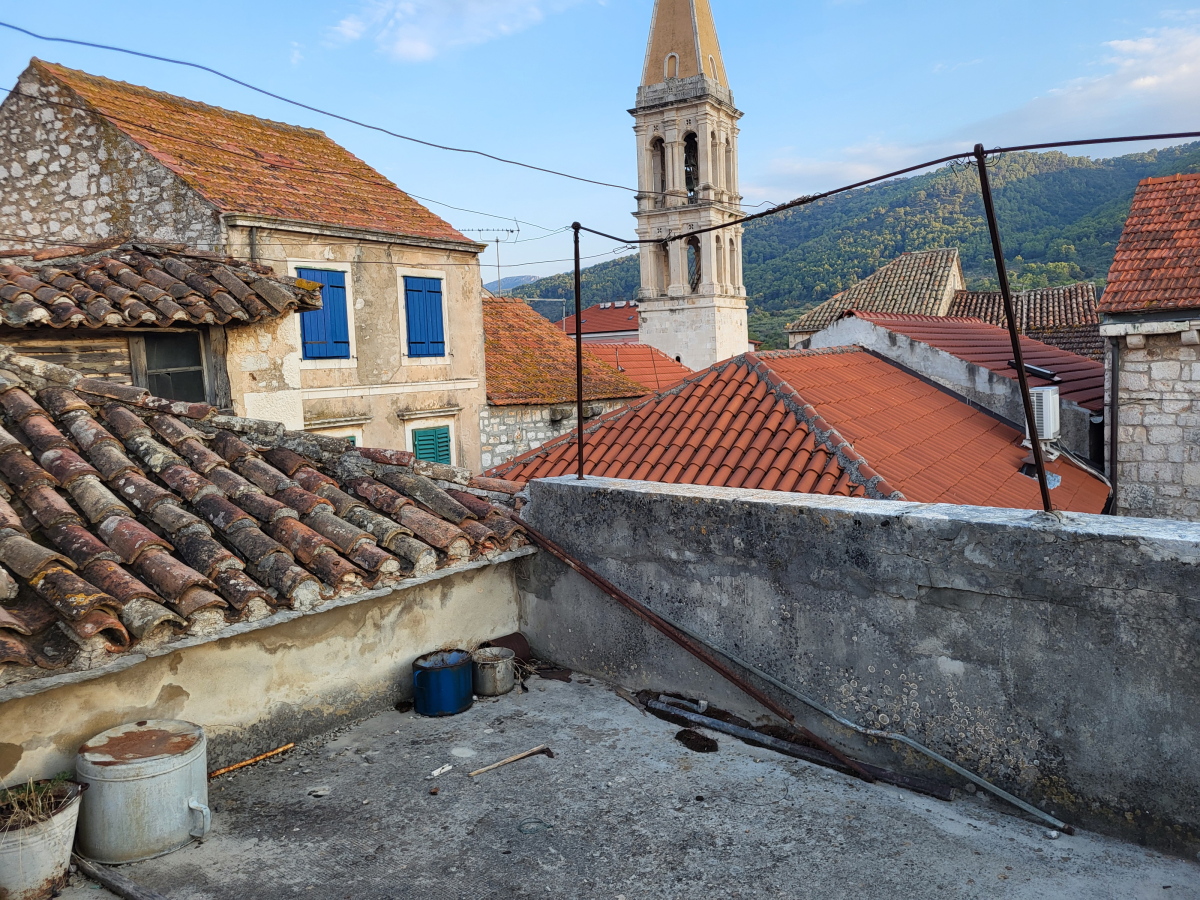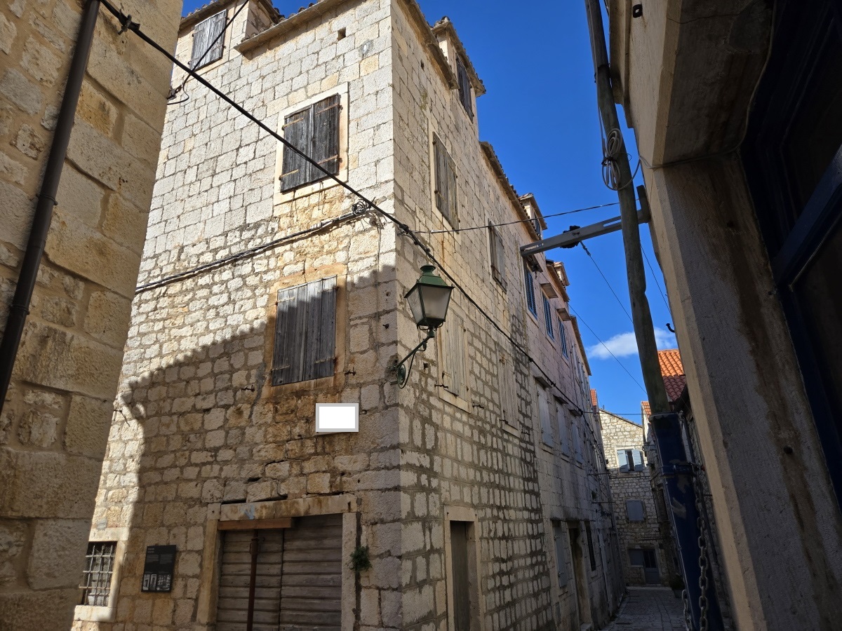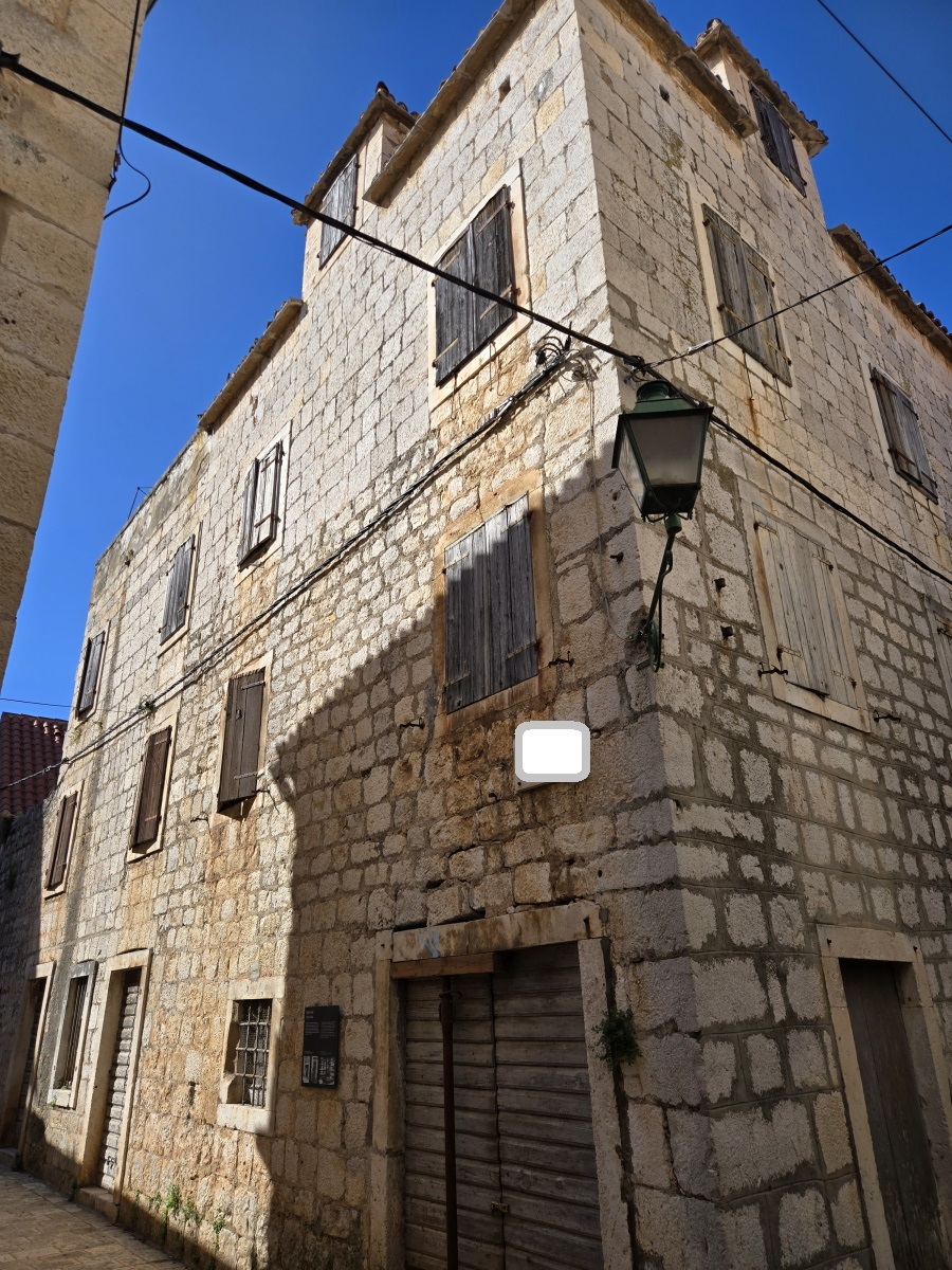 Kamena kuća u centru Starog Grada na Hvaru. Objekt se sastoji od prizemlja, 2 kata i potkrovlja s terasom. Udaljena je minutu od rive i restorana, a opet nudi privatnost i mir. Lokacija kuće, kvaliteta kamena i njezin karakter daju ovoj nekretnini potencijal za komercijalnu kao i osobnu upotrebu. Potrebna je potpuna obnova. Kuća predstavlja dio povijesti grada koji neprekidno živi već 2400 godina.